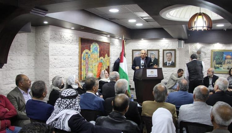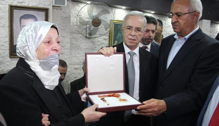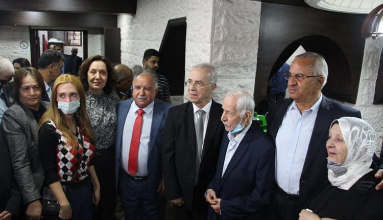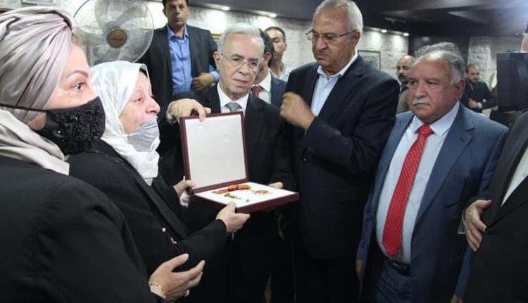 واستعرض الدكتور خلف المفتاح ( المدير العام لمؤسسة القدس الدولية) عمق العلاقة التاريخية بين سورية و فلسطين كوطن واحد و جسد واحد فبقيت القضية الفلسطينية القضية المركزية لسورية . ثم قدم السفير الرفاعي لذوي المكرمين وللأخ عبد الله الدنان أوسمة التكريم والشهادات المقدمةمن سيادة الرئيس عباس ليقوموا بدورهم بشكر سيادته على هذه اللفتة الكريمة مثمنين رغبة القيادة الفلسطينية بتكريم من لهم دور ريادي في انطلاقة الثورة الفلسطينية المعاصرة.