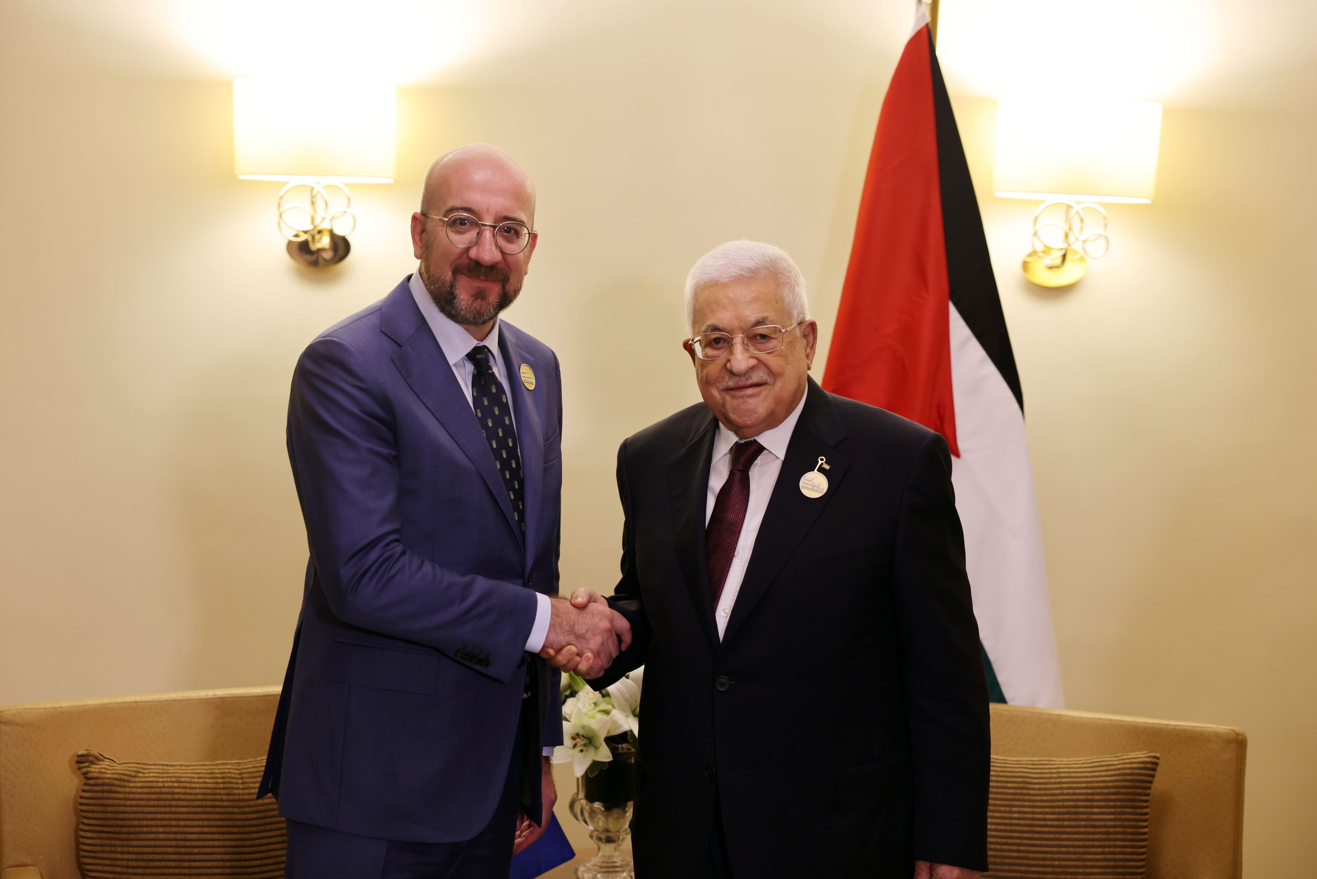 عمان 11-6-2024 وفا- التقى رئيس دولة فلسطين محمود عباس، اليوم الثلاثاء، رئيس مجلس الاتحاد الأوروبي شارل ميشيل، في مقر اقامته بمنطقة البحر الميت، على هامش مشاركته في أعمال “مؤتمر الاستجابة الإنسانية الطارئة لغزة”.