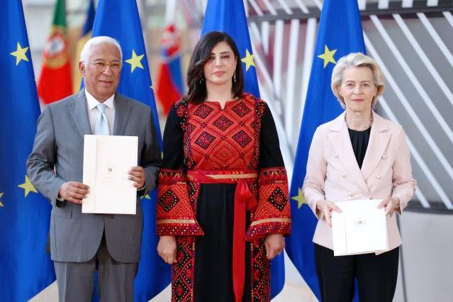بروكسل 20-5-2025 وفا- في سابقة دبلوماسية تاريخية، قدمت سفيرة دولة فلسطين لدى بلجيكا ولوكسمبورغ والاتحاد الأوروبي، أمل جادو شكعة، رسالة تعيينها الرسمية إلى كل من رئيس المجلس الأوروبي، أنطونيو كوستا، ورئيسة المفوضية الأوروبية، أورسولا فون دير لاين، وذلك خلال مراسم رسمية أقيمت مساء اليوم الثلاثاء، في مبنى أوروبا التابع للمجلس الأوروبي في العاصمة البلجيكية بروكسل.